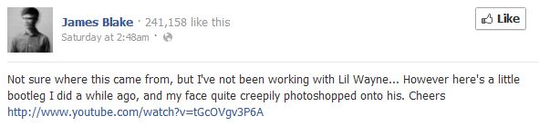 When you think about it, isn’t this the exact same set of feelings Chris Hillard experienced on that fateful day he barged into the bathroom and found out that the British nanny he’d grown to love and respect was actually his American father in makeup and a fat suit? If there’s anything I learned from Mrs. Doubtfire, it’s that recontextualization changes things. I bring this up because I had another Mrs. Doubtfire moment this weekend as a result of something James Blake posted to Facebook in reaction to whispers that he was collaborating with Lil Wayne: