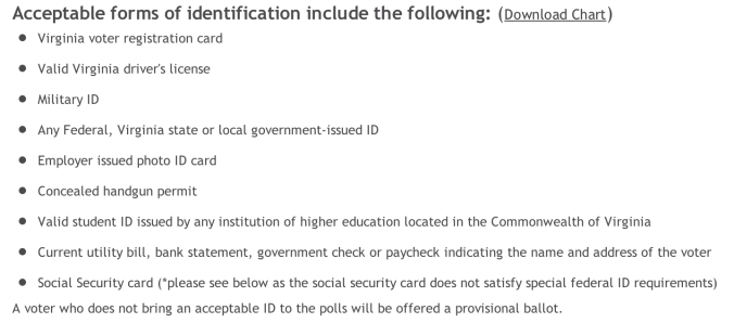 Click here to find your local polling location and, while you’re at it, make sure to find out if you need to bring an ID. Thanks to some amazing, A-grade assholery, this has become a “major issue” (it’s hard to make quotation marks sarcastic over the Internet, but these are intended to be as disingenuous as they come), so it’s best to be prepared. If you’re reading this in Virginia, these are the acceptable forms of identification, as listed on the Virginia State Board of Elections website:
