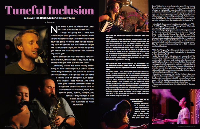 A couple of years back, my band opened for a Baltimore-based group called Community Center at the Tin Pan, and I have such happy memories of that evening. One thing that stands out to this day as I look back is how warm and kind the Community Center folks were, and I can confirm after interviewing guitarist and vocalist Brian Loeper for the latest issue of River City Magazine that their commitment to inclusion runs even deeper than I realized, down to the bedrock of how they approach writing and performing.